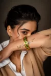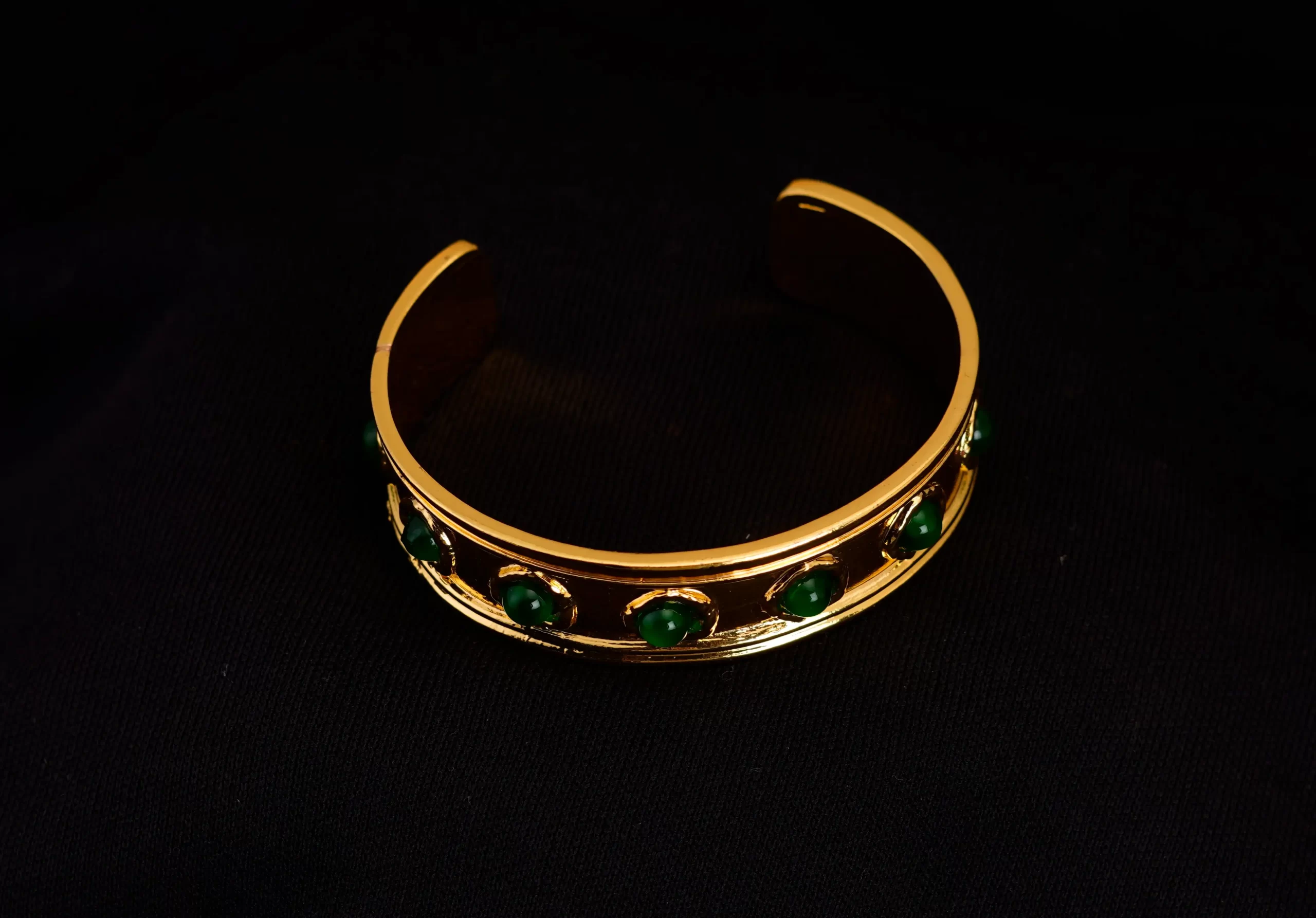 Presenting the Smara Gold Cuff – a showstopper with a fab textured design to jazz up any look! Bedecked with stunning green gemstones, this cuff is crafted from 18k gold-plated stainless steel, promising both durability and glamour. Its easy slip-on style is adjustable and hypoallergenic, boasting a nickel-free bonus for extra comfort. Plus, the shiny high-polish finish ensures you’ll be sparkling like a star!