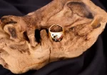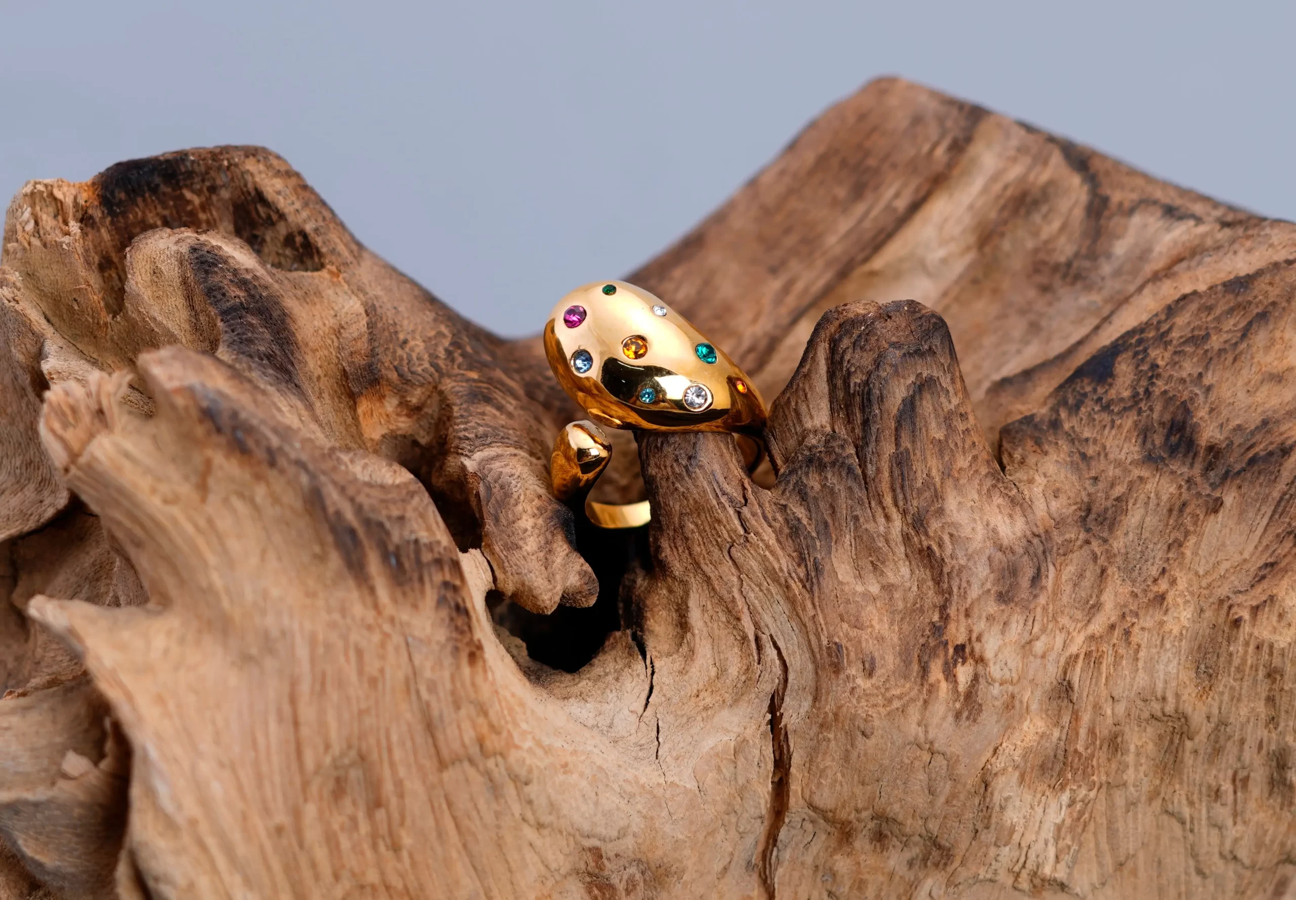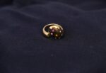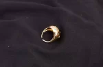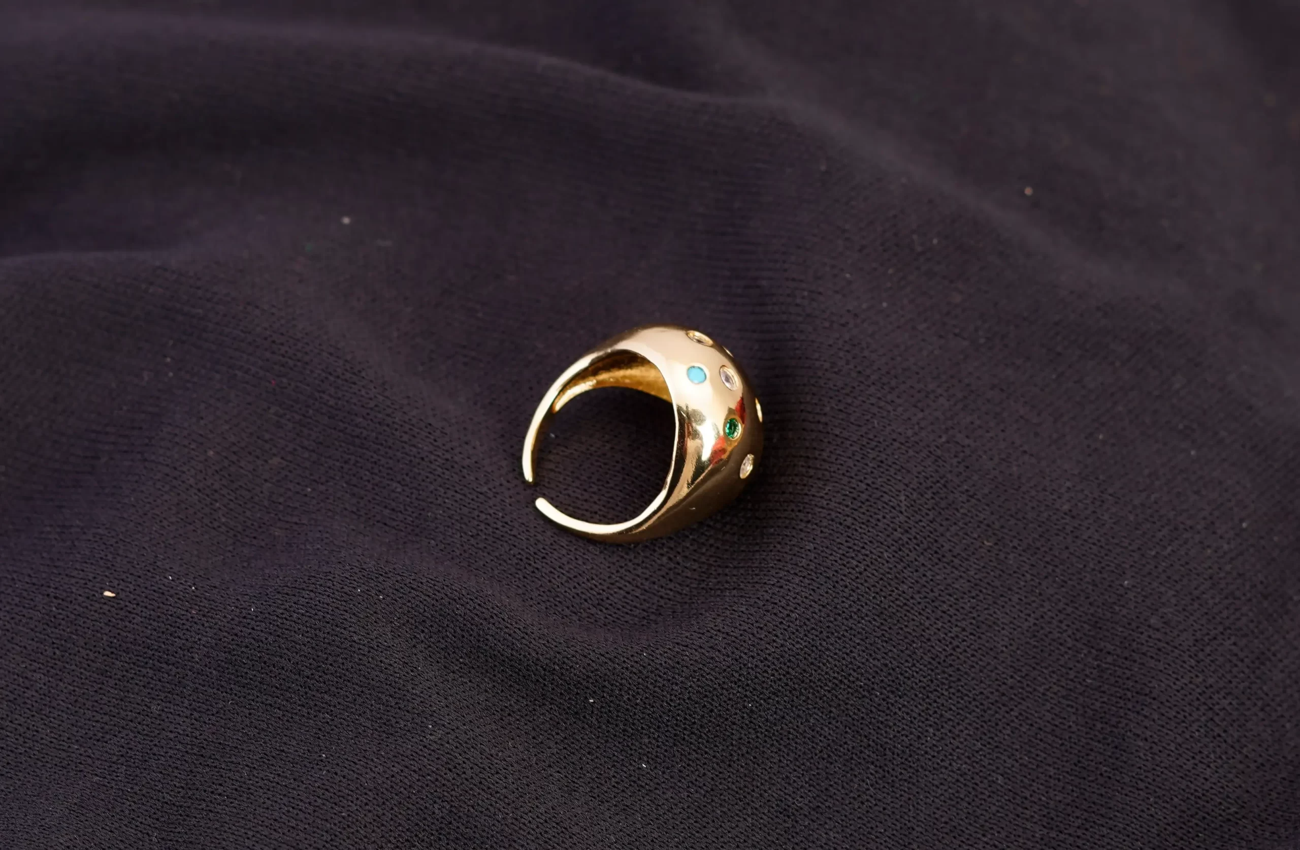 • A lightweight oval ring made of gold with colorful stones adorning its head..