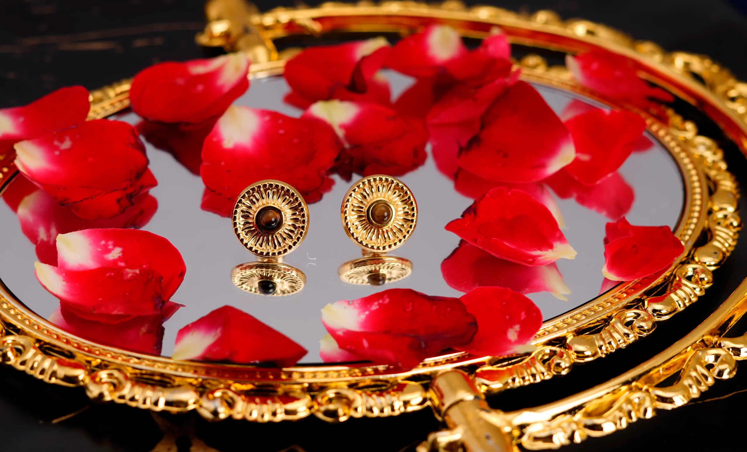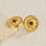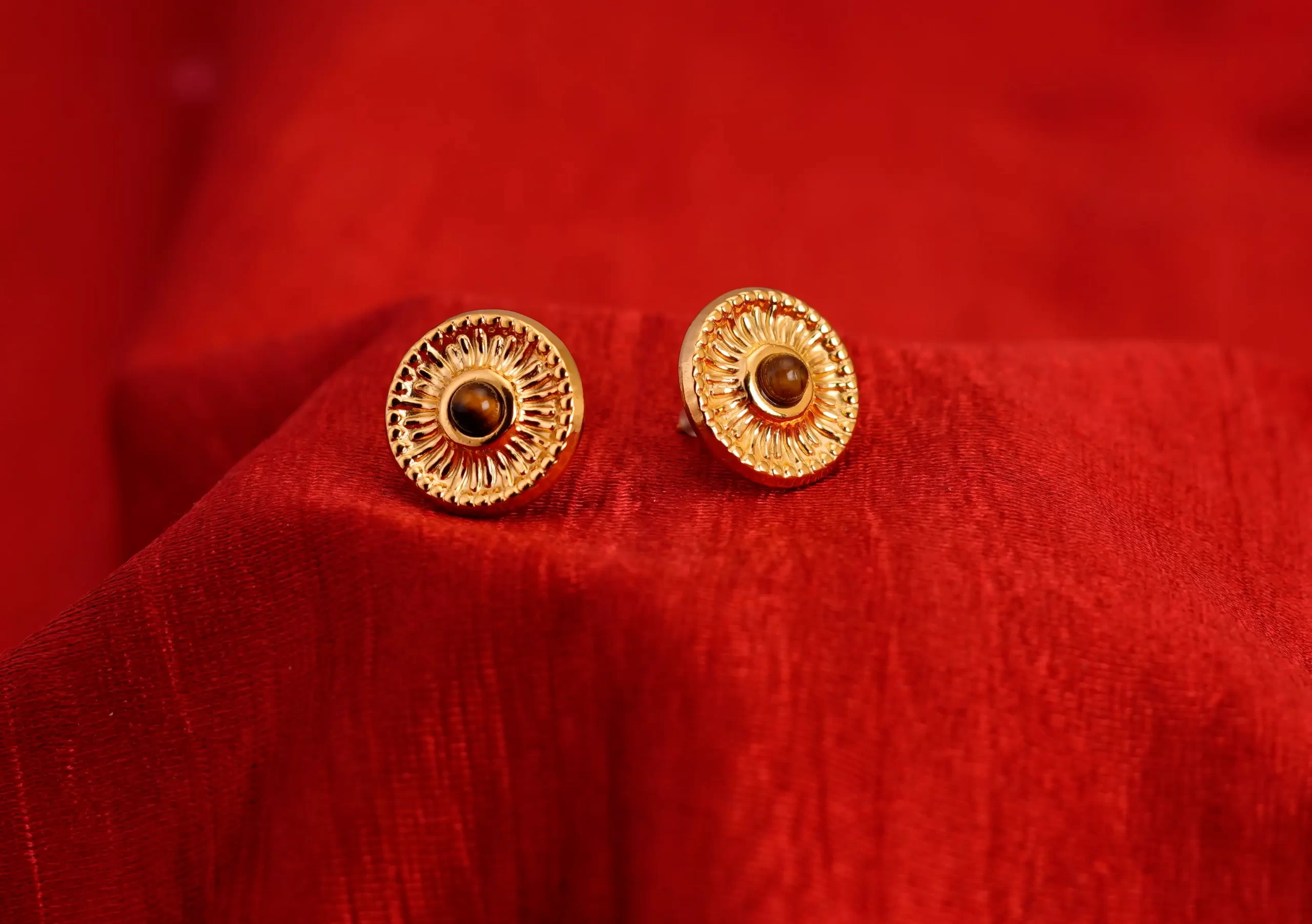 • The round stud earrings feature a tiger’s eye stone at the center.